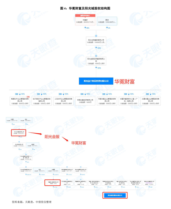 阳光城集团股份有限公司(以下简称“阳光城”,000671.SZ)体系理财平台为阳光泓宁财富管理有限公司(以下以理财品牌“华冕财富”简称)。经天眼查穿透,华冕财富股权路径为:华冕财富—阳光金服投资集团有限公司(以下简称“阳光金服”)—阳光龙净集团有限公司(以下简称“阳光龙净集团”),其中阳光龙净集团亦为阳光城间接控股股东(股权路径可简化为:阳光城—福建阳光集团有限公司(以下简称“福建阳光”)—阳光龙净集团)。综上可知,华冕财富为阳光城间接控股股东(阳光龙净集团)旗下发行平台。