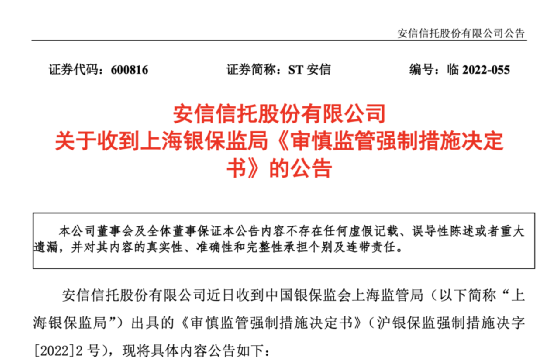 安信信托股份有限公司近日收到中国银保监会上海监管局(以下简称“上海银保监局”)出具的《审慎监管强制措施决定书》(沪银保监强制措施决字[2022]2 号)。