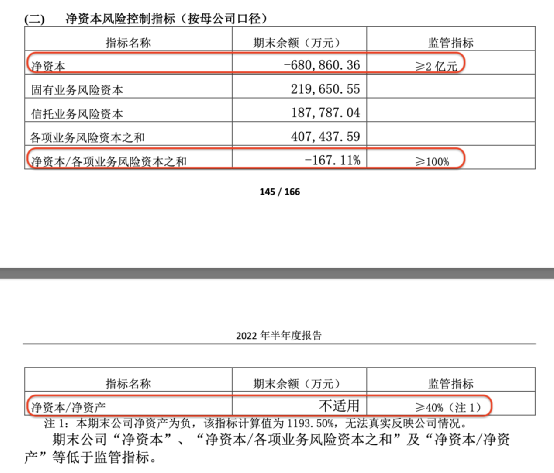 具体来看,安信信托日前公布的半年报显示,安信信托2022年上半年净资本为-68亿元,不符合监管指标“≥2 亿元”;净资本/各项业务风险资本之和为-167.11%,不符合监管指标“≥100%”;净资本和净资产均为负值,有关指标无法真实反映公司情况。