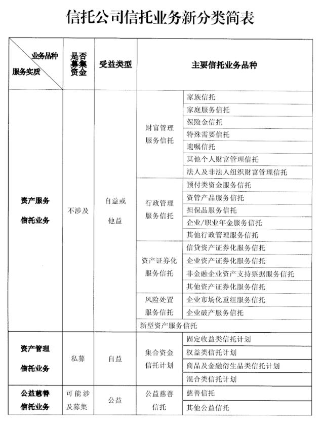 近日,银保监会正式印发《中国银保监会关于规范信托公司信托业务分类的通知》,将信托业务分为资产服务信托、资产管理信托、公益慈善信托三大类共25个业务品种。