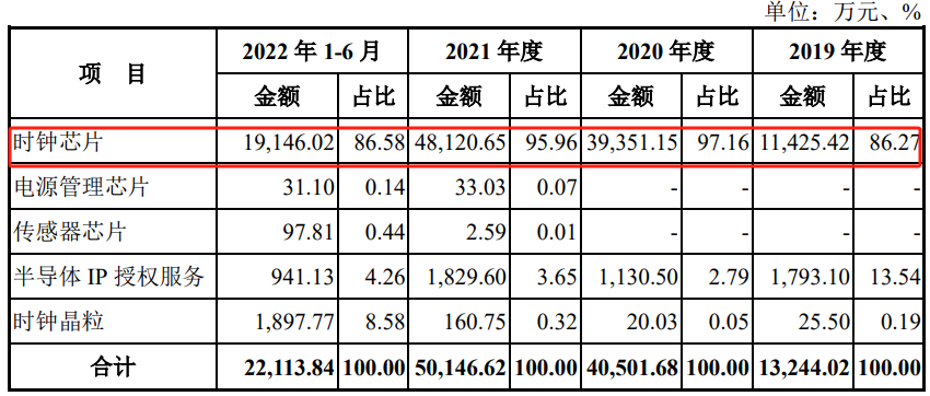 但实际上,公司的产品收入结构高度集中在时钟芯片上,报告期内(2019年至2021年及2022年上半年),高的年份时钟芯片的收入贡献度可以达到97%,低的年份也达到86%。