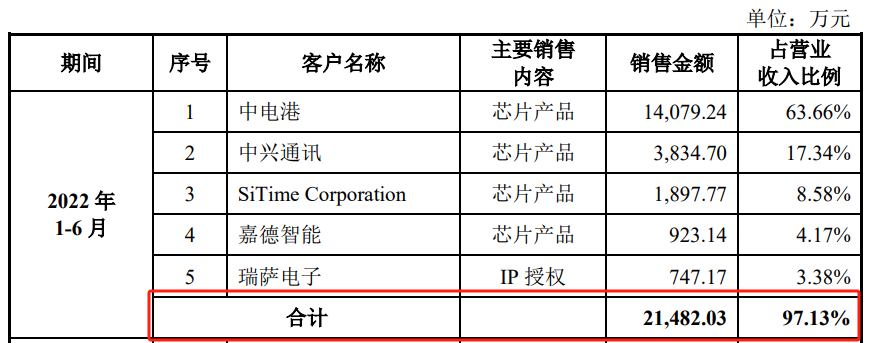 具体看,2019年、2020年、2021年和2022年1-6月,公司对前五大客户销售收入合计占当期营业收入的比例分别为96.55%、98.93%、98.01%和97.13%,其中来自第一大客户的收入占营业收入的比例分别为85%、92.26%、84.41%和63.66%。