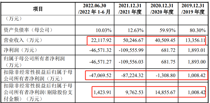 报告期内,公司净利润分别为1893万元、681.75万元、-10.96亿元和-4.66亿元,截至2022年6月30日累计未弥补亏损为-13.71亿元。公司称,主要原因是2020年实施了股权激励,分期确认了高额的股份支付费用,报告期内公司扣除非经常性损益后净利润(剔除股份支付金额)分别为1008.42万元、1.49亿元、9762.53万元和1423.91万元,波动较大。