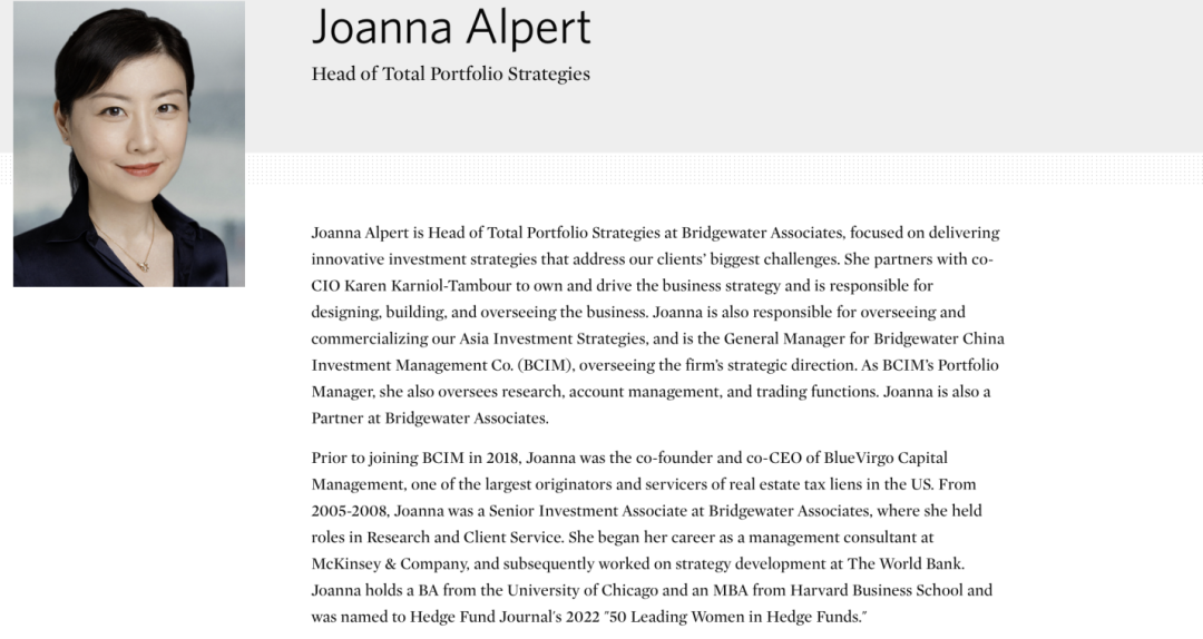 来自官网的信息显示,孙悦升任桥水全组合策略(Total Portfolio Strategies)主管,聚焦提供创新型的投资策略,为客户面临的最大挑战提供解决方案。