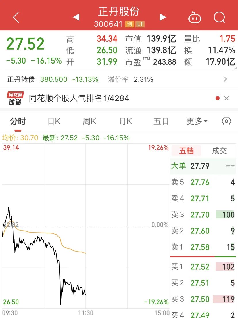 今年来的A股“人气王”,10倍大牛股正丹股份,今天突然出现闪崩,早盘还呈现拉升态势,一度涨近5%,而后突然跳水出现闪崩,一度跌超19%,逼近跌停态势。盘中跌幅超20%。