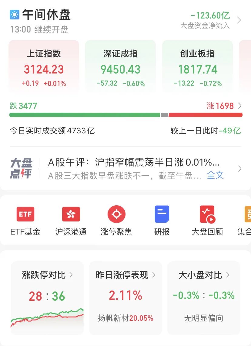 上午收盘,A股上证指数微涨0.01%,深证成指跌0.6%,创业板指数跌0.72%,个股跌多涨少,3477只下跌,1698只上涨,成交额4733亿元。