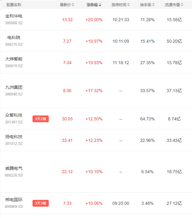 电力相关股票掀起涨停潮,金利华电、电科院、大烨智能等20%涨停,郴电国际、明星电力、西昌电力等10%涨停。