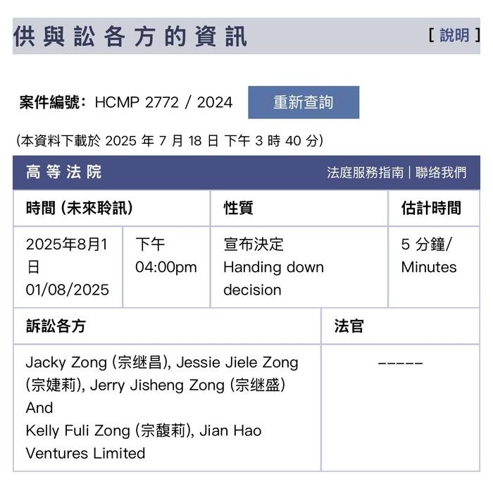 界面新闻记者注意到,该案件8月1日将在香港高等法院进行聆讯,性质是宣布决定,估计时间只有5分钟,预计会是一个程序性的流程。
