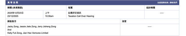观察者网查阅到,据香港高等法院披露信息,双方的诉讼费评定的聆讯,将在12月23日上午举行,诉讼各方包括宗馥莉、JIAN HAO VENTURES LIMITED(建浩创投有限公司),以及宗氏另外三名子女。